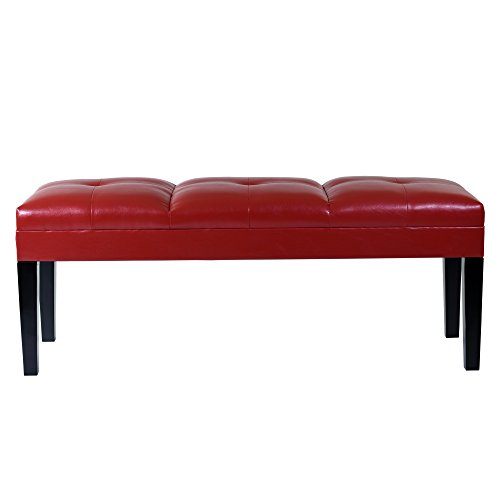 The Armen living Howard contemporary button-tufted bench is a beautifully ornate bonded leather piece sure to add flair to the modern living room. This elegant bench sports three button tufting, accentuating the plush of the upholstered seat. The frame is made of sturdy hardwood, assuring durability while maintaining style. This Howard is available in black, brown, cream, and red.Elegant 3-button Howard Bench.