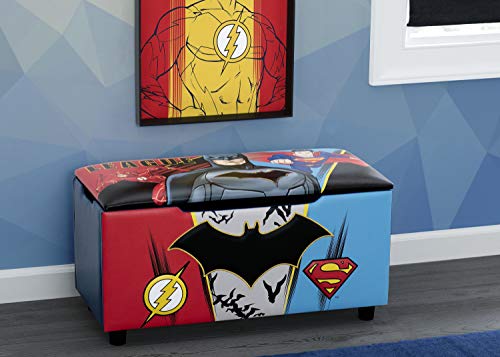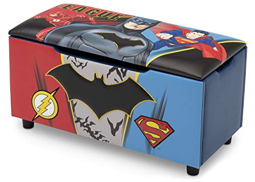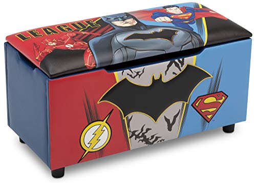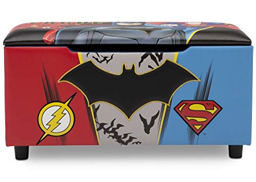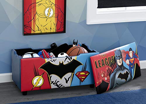Batman, Superman and Flash have teamed up to create the ultimate seating solution with the DC Comics Justice League Upholstered Storage Bench from Delta Children. Dynamic, 3D applique detailing brings the A-team to life, while the durable, wood frame and fully upholstered construction ensures it's built to last. Use it at the foot of your child's bed, in the playroom or the living room-no matter how you use it, this fully upholstered bench has you covered. For added functionality, the plush padded top of this bench opens to reveal tons of storage for toys, blankets or games. The ultimate team of superheroes is now ready to provide a versatile seating option where you can put on shoes or just kick back and relax. The Justice League Upholstered Storage Bench perfectly coordinates with other Justice League items from Delta Children.