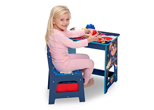 Playtime, mealtime or study time will be more animated than ever with the DC Super Friends Kids Desk and Chair Set by Delta Children! Perfectly sized for your little superhero, your child will love sitting down at this coordinating, desk and chair set, featuring vibrant, stylized graphics of Batman, Superman and the Flash. Action-packed catch phrases and logos of your child's favorite superheroes add plenty of fun and adventure to any activity, whether they are doing homework, or drafting plans to fight crime. The desk provides the perfect space for your child to do homework, art projects or eat, while the cleverly designed chair features a storage bin underneath for easy access to art supplies, toys, books, or games! A smart and sturdy option for your child's bedroom or playroom, this durably constructed wood desk and chair set will stand up to years of use. Bring home the spirited excitement and fun of the DC Super Friends with this Kids Desk and Chair Set.