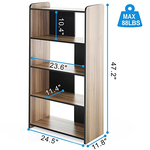 12mm brown oak each shelf can support 44lbs.