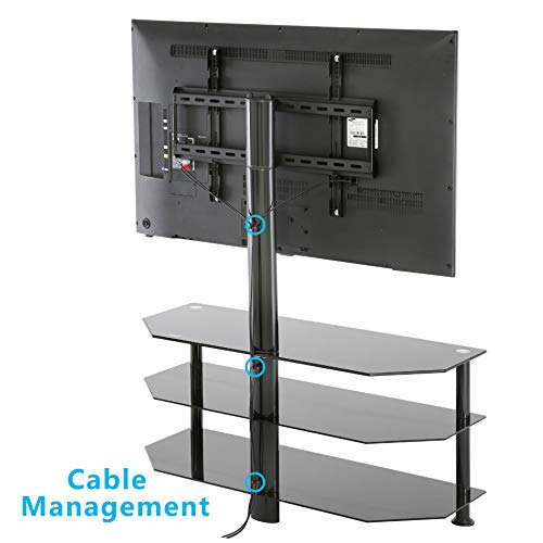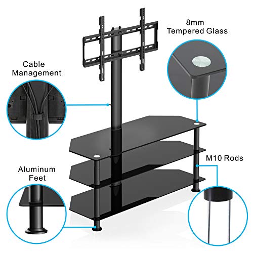 TEMPERED GLASS TV STAND - 8/5/5mm black tempered glass,Capacity for shelf:55lbs, 110lbs for mount, back aluminum tube with cable management system to hide the messy cable