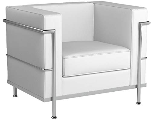 The White Leather Chair with Encasing Frame brings comfort and trend-setting style to your waiting room, reception area or home.It features a straight arm design and a removable square seat cushion, all padded with 5'' of CA117 fire retardant foam and upholstered in leather. A stainless steel frame, accent bar enclosure and integrated legs give this chair added strength and a distinctive flair. Make a great impression on your clients and customers with this innovative contemporary chair.Contemporary Design