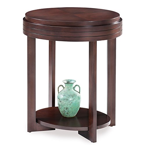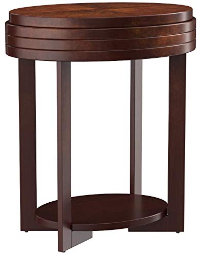 The Chocolate Cherry Oval End Table offers the a perfect solution for corners and transitional spaces in the room. This table has a beautiful silhouette with a grooved and diamond matched veneer table top. A lower display shelf lets you show off your favorite collectibles. The table is finished in a rich, hand applied Chocolate Cherry finish that lets the beauty of the solid wood grains shine through. With its small scale, the table is perfect for small spaces like condos and apartments. Simple assembly allows this table to be a part of your home in no time!Rich hand applied Chocolate Cherry Finish