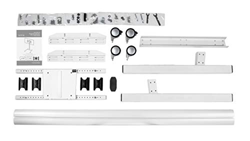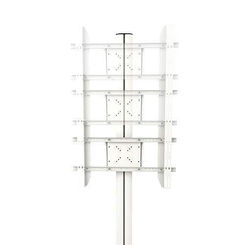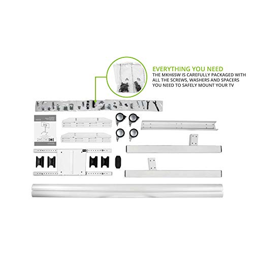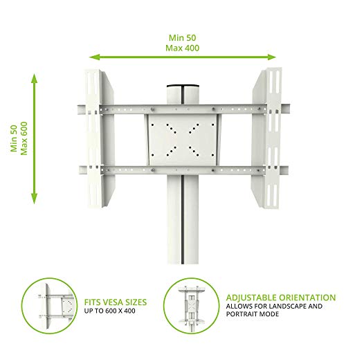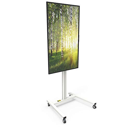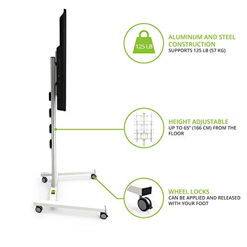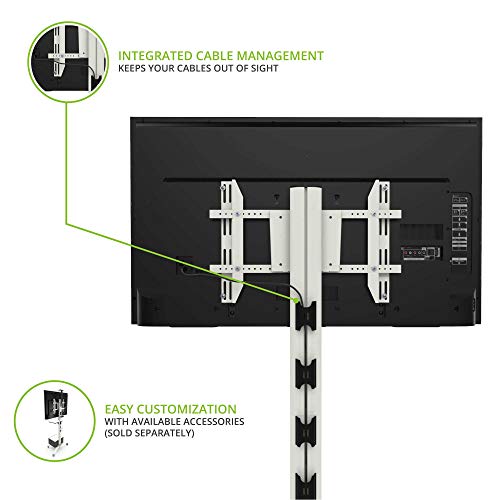 The MKH65W Rolling TV Stand features 3-inch lockable casters that make it easy to maneuver over carpet, cables and other thresholds. Its aluminum center column provides support for screens weighing up to 125 pounds, and features four channels to attach a variety of available shelving, storage and handle accessories. To ensure optimal viewing, this versatile cart allows the center of your TV to be positioned up to 65 inches from the floor and supports both landscape and portrait orientations. Cables can also be routed through removable clips to maintain a clean and professional appearance. Accessories sold separately. Available in black or white.EASY MANEUVERABILITY - 3" wheels and an elevated base provide clearance while rolling over cables and other thresholds.