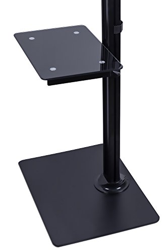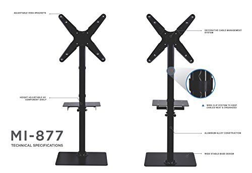 The MI-877 Floor Stand TV mount is the perfect solution when you need a portable version of a mobile TV stand, TV cart, or an outdoor TV stand. It also includes a height adjustable glass shelf that can hold up to 11lbs for a DVD player, cable box, or a custom component box. The wide, heavy steel base safely supports compatible TV sizes from 32" to 70". Extra features include a tilting TV bracket, integrated cable management, and VESA adapters.