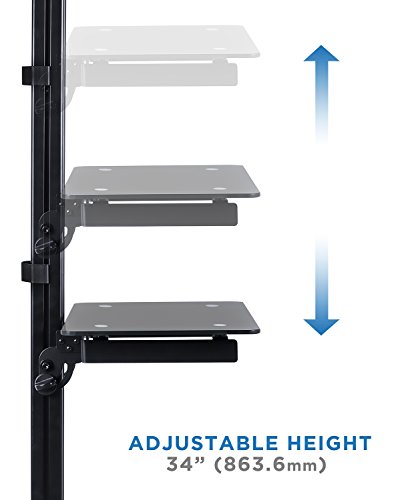 ADJUSTABLE VIEWING. The tv mount bracket can tilt 14 degrees and the height adjustable glass shelf carries up to 11 lbs for perfect entertainment set up.