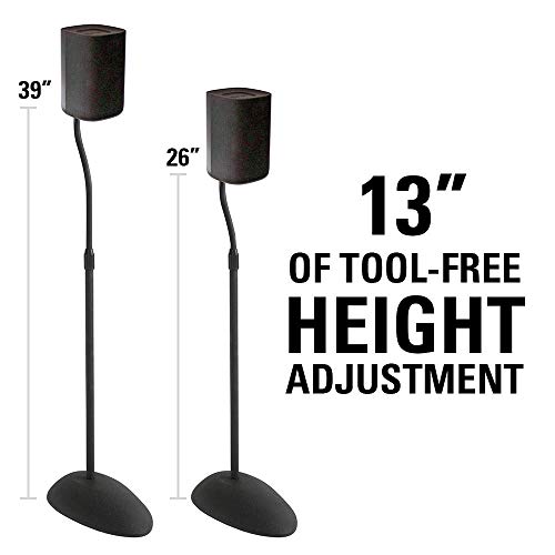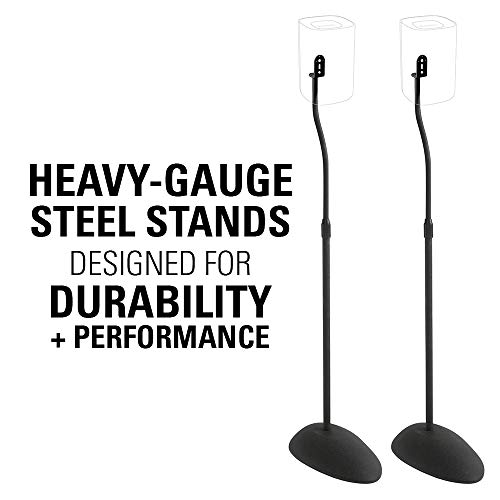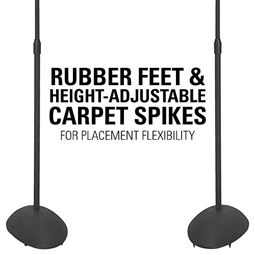 The SANUS Home Theater Series HTB3 is an adjustable black speaker stand for satellite speakers up to 4 lbs. Its heavy-gauge offset-shaped steel pillar is adjustable from 26 to 39 inches for optimum acoustics. A stable black steel teardrop base includes rubber feet and carpet spikes for superior stability on any surface. Includes top plate, “L” brackets and a QuickMount adapter for speakers with keyholes on the back. This product is sold as a pair.Easily adjustable 26"-39" height brings speakers to optimal listening level