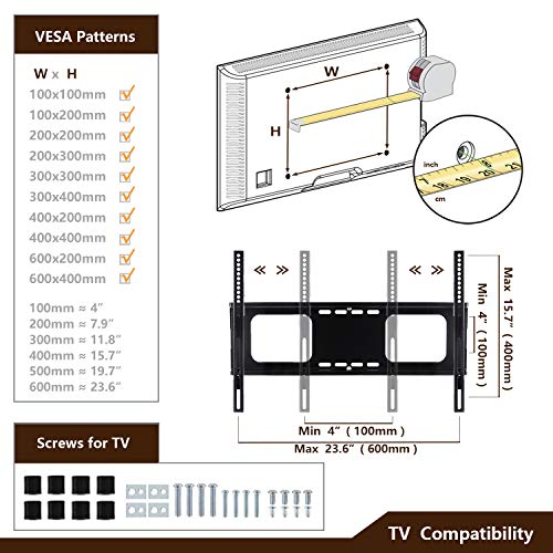 ▶FITS 32-65 INCH TVS - This mount will fit most TVs from 32 37 42 47 50 55 60 65 inch LCD/LED/Plasma TVs. To make sure this mount will fit insure your TV's VESA bolt pattern falls between these two sizes : 100(h)mm x 100(w)mm up to 400(h)mm x 600(w)mm, fit for TV brands such as Samsung LG Electronics Sony Sharp Panasonic Philips Vizomax Cello Bush Blaupunkt JVC Hitachi Hisense Goodmans Finlux Toshiba LCD LED OLED QLED Plasma TVs .