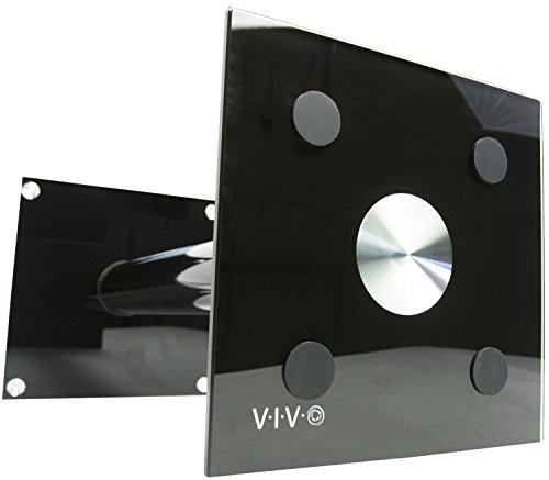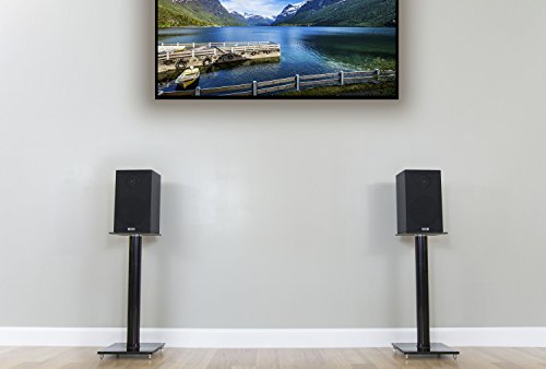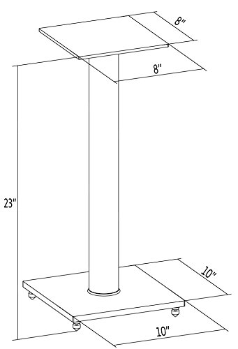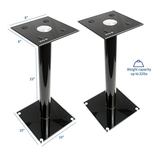 VIVO premium universal aluminum and glass speaker stand (2 stands) for satellite speakers, bookshelf speakers, and more. Designed to elevate your speakers and enhance audio sound, STAND-SP02B's sleek attractive appearance is perfect for any home theater system. The stands are supported by a sturdy aluminum pillar and can carry weights up to 22 lbs each. Features include removable carpet spikes for a sturdy foundation on most surfaces, and internal cable management to keep power and audio cords clean and organized. The shelves are made from sturdy tempered glass and the entire stand has a glossy black appearance. Total height from the floor to the top shelf measures 23". The top shelf measures 8" x 8" and the base measures 10" x 10".
