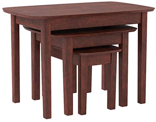 Space-saving design, this nesting table set has simple lines and traditional good looks. Each table has a rounded rectangular top and 4 tapered legs.Beautiful walnut finish.All three tables has different shapes and sizes, uniquely styled.