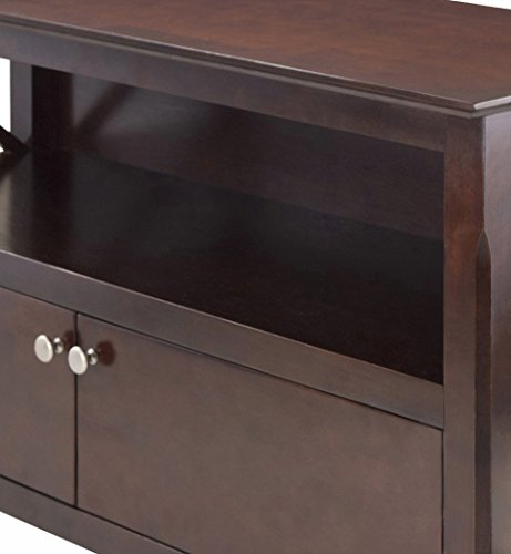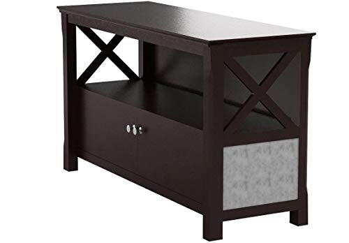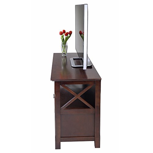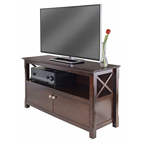 Xola family has a new member, TV stand, to help complete your room. Wide and roomy, this media center offers storage space and two wood panel doors. Quality construction and design. Contemporary looks blend seamlessly into any decor. Open storage section is 39.29"W x 14.37"D x 8.27'H. Behind two doors is 2 sections of storage with each has 19.25"W x 13.58"D x 8.27"H in size. Accommodate up to 46" Flat screen TV. Xola TV Stand has an overall assembled size of 44.02"W x 15.94"D x 24.02"H. Construction with combination of solid and composite wood in Cappuccino finish. Assembly required.X legged TV stand with 2 doors